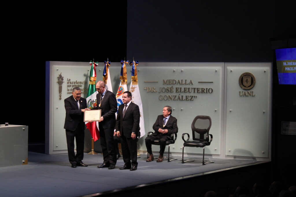 - La primera medalla fue entregada al Dr. Miguel Mariano Escobedo Villarreal, pionero en trasplante hepático a nivel estatal y nacional.
