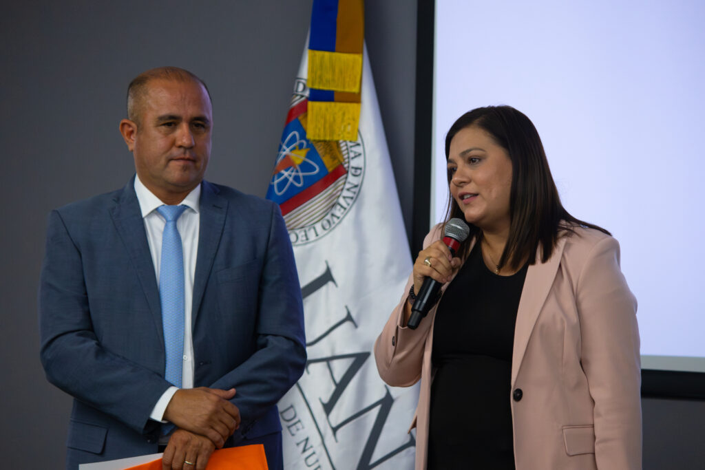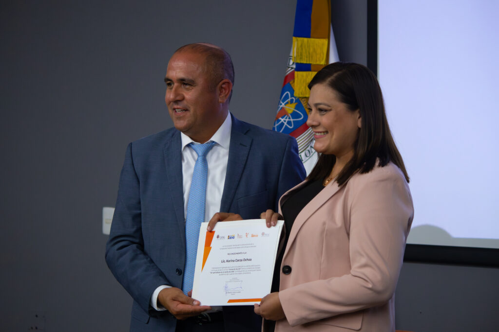 El Dr. Mario Rojo le entregó a la ponente un reconocimiento por la conferencia, organizada desde la Subdirección de Vinculación de la FCC.